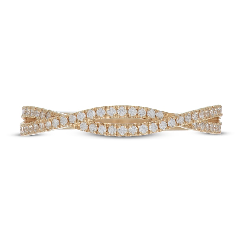 Graceful, sparkling twists of round diamonds form this elegant Neil Lane Bridal® wedding band for her, which is designed to fit alongside the matching engagement ring (sold separately). The ring is crafted of 14K yellow gold, and the diamonds total 1/4 carat in weight.