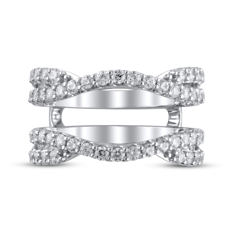 Two interweaving rows of brilliant round-cut diamonds sparkle above and below the space for her engagement ring or diamond solitaire ring (sold separately) as a beautiful way to add extra sparkle. Crafted in 14K white gold ring has a total diamond weight of 1 carat. Available online while supplies last. Previously Owned Treasures are not eligible for in-store pickup. Previously Owned Treasures may only be shipped either to your home address or to an alternate address.