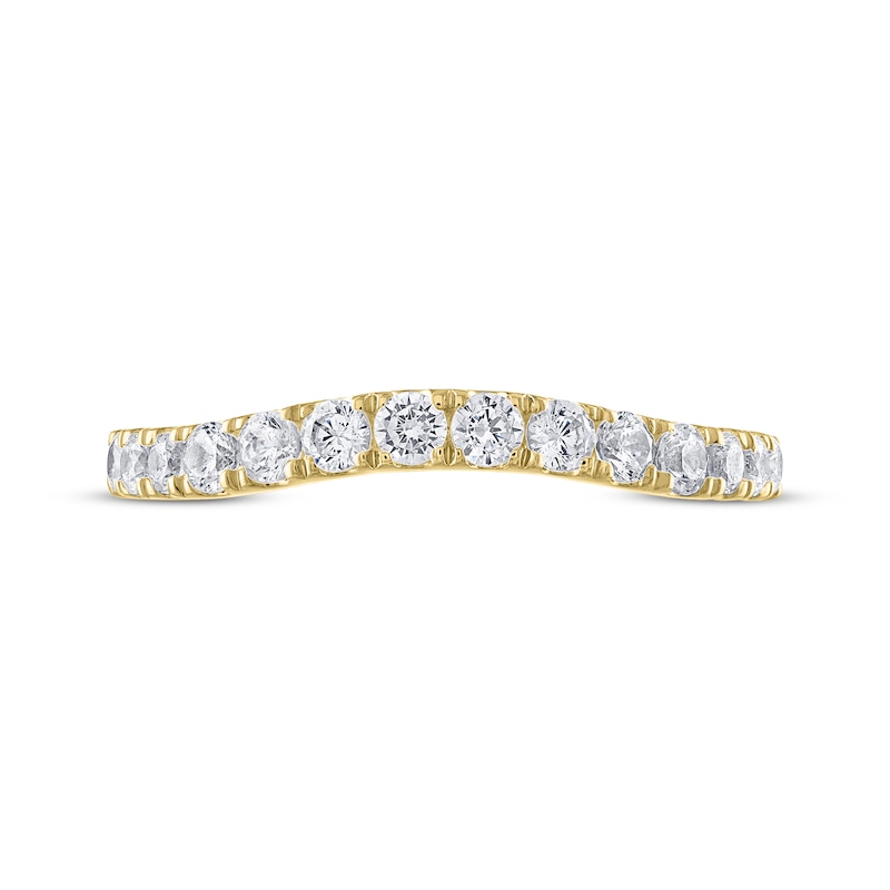 Say "I do" with this glittering wedding band designed to complement her THE LEO Ideal Cut® Diamond engagement ring. Graduated-size round-cut diamonds adorn the gently curving band, which is crafted in 14K yellow gold. The style has a total diamond weight of 1/2 carat and is contoured to fit alongside her engagement ring (sold separately).