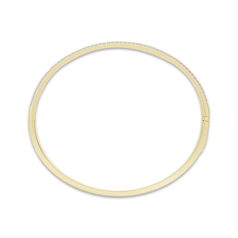 Simple yet sparkling, this bangle bracelet is adorned by a sweeping row of dainty round-cut diamonds closed with a box clasp. Crafted in polished 10K yellow gold with a rhodium finish, the bracelet has a total diamond weight of 1/2 carat.