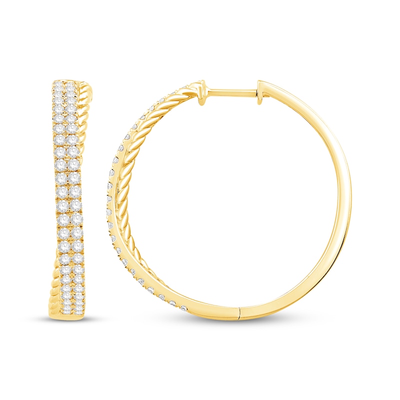 Wow her with the sparkle and interest of these crossover hoop earrings. These earrings feature two rows of round diamonds that diagonally cross over a band of polished braided 10K yellow gold. The earrings have a total diamond weight of 1 carat and secure with hinged backs.