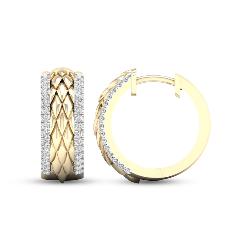 Add intrigue to your look with these eye-catching gender neutral earrings. The wide hoop features quilted texturing and rows of pave-set diamonds that glitter along the edges. Crafted in 10K yellow gold and white rhodium, the earrings have a total diamond weight of 1/4 carat and secure with hinged backs.
