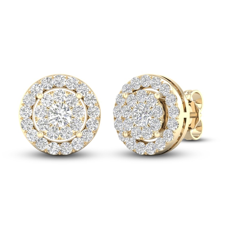 These stunning diamond earrings will be treasured forever. Bright center clusters of round-cut diamonds shine even brighter amidst sparkling halos of more round-cut diamonds emitting a dazzling display of sparkle. The earrings are fashioned in iconic 10K yellow gold with a total diamond weight of 1 carat and secure with friction backs.