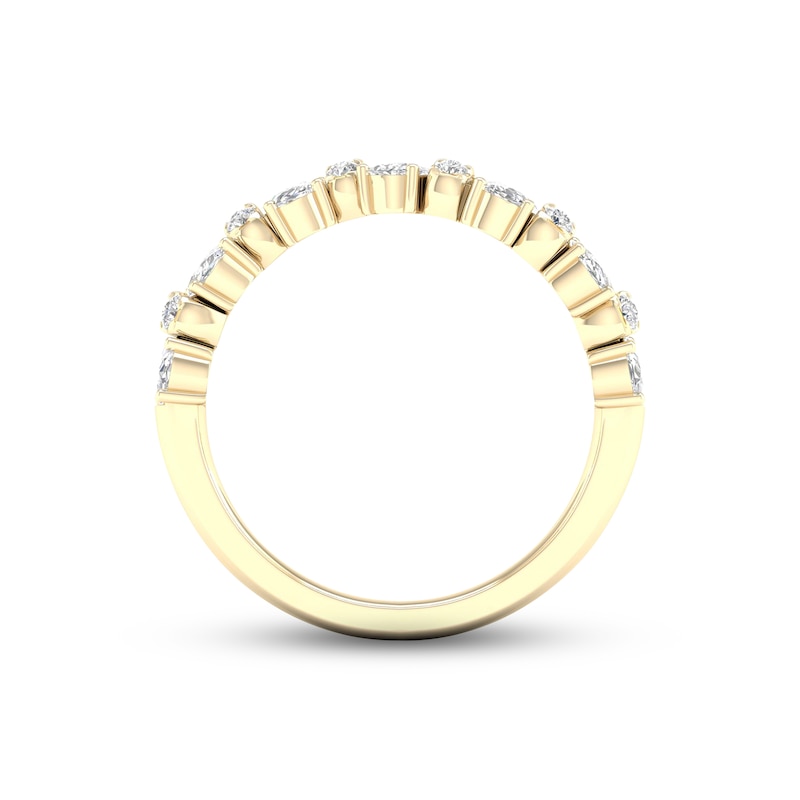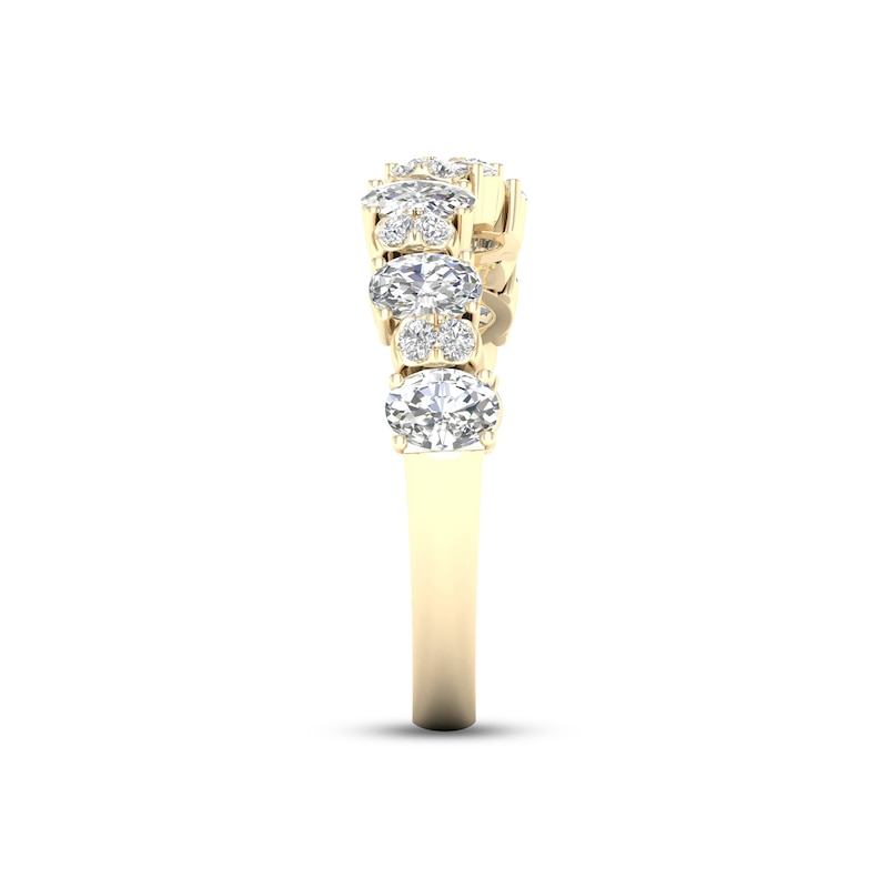 This breathtaking ring for her features a slightly curved design set in timeless 14K yellow gold. Stunning oval-cut diamonds alternate with duos of brilliant round diamonds throughout, totaling 1 1/4 carats.