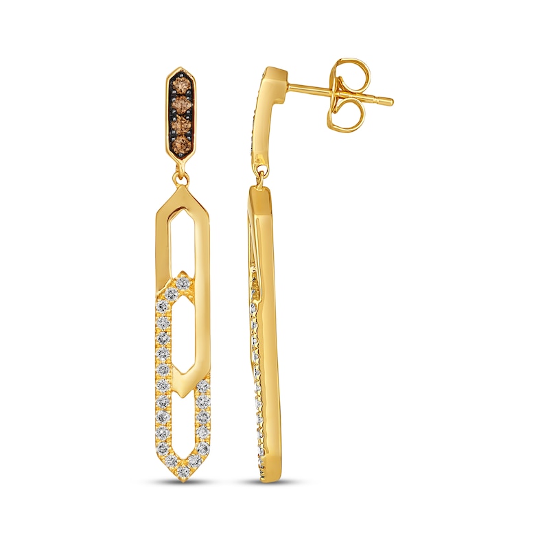 These gorgeous earrings from Le Vian® get the drop on fashion. Created in warm 14K Honey Gold™, these long hexagon dangles feature Nude Diamonds™ and rich Chocolate Diamonds® for a total diamond weight of 3/8 carat. The post earrings secure with friction backs. Le Vian®. Discover the Legend.