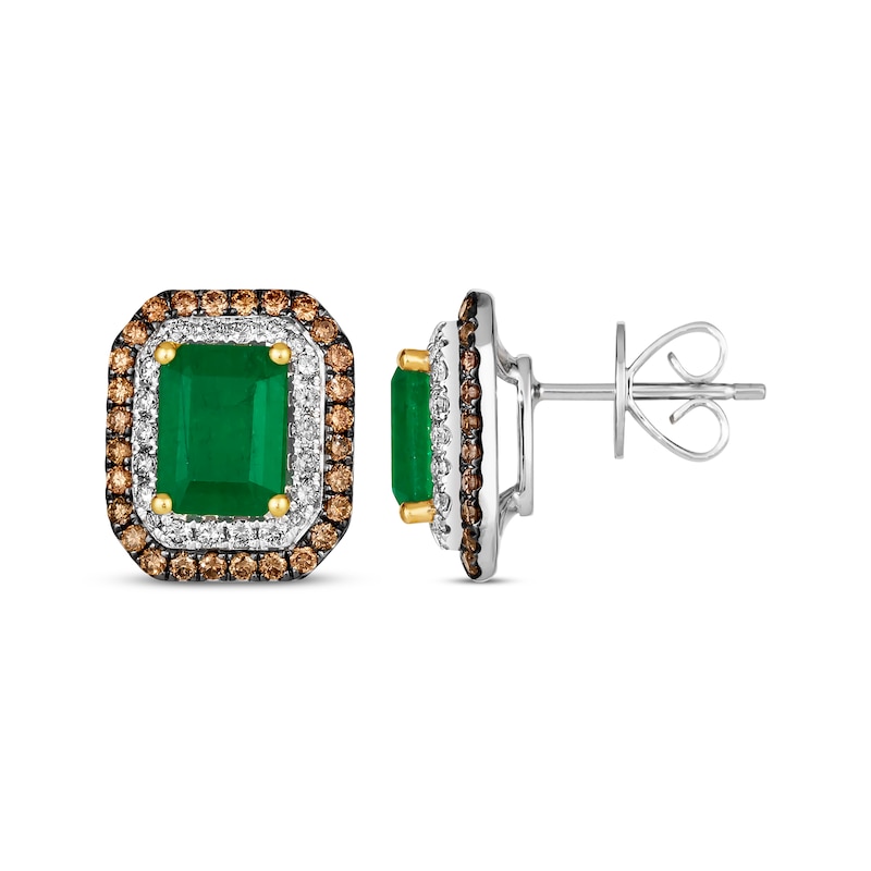 Bring natural tones to your look with the tempting style of these stud earrings from Le Vian®. Created in 14K Vanilla Gold®, each earring showcases an emerald-cut Costa Smeralda Emeralds™ stone with 14K Honey Gold™ prong details. Frames of round-cut Nude Diamonds™ and Chocolate Diamonds® bring the total diamond weight to 7/8 carat. These post earrings secure with friction backs. Le Vian®. Discover the Legend.