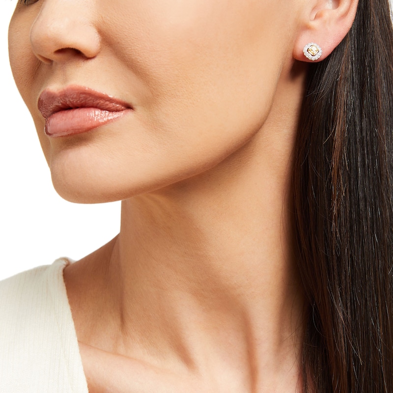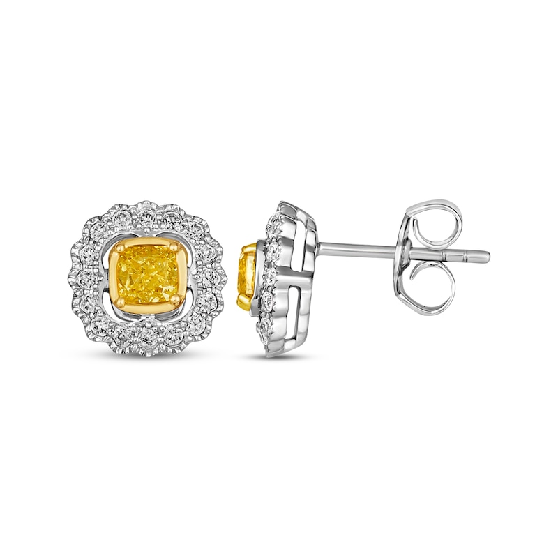 These gorgeous earrings feature cushion-cut Sunny Yellow Diamonds® set in 14K Honey Gold™ and ooze with optimism. Sweet round-cut Vanilla Diamonds® form the decorative surrounds for a delightful finishing touch. Fashioned in cool 14K Vanilla Gold®, the earrings have a total diamond weight of 5/8 carat and secure at the post with friction backs. Le Vian®. Discover the Legend.