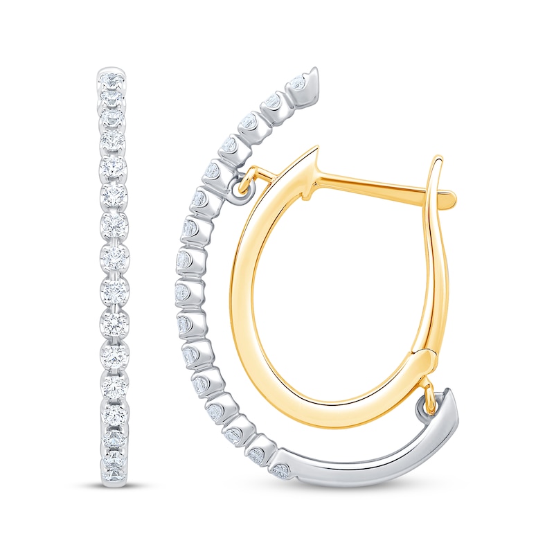 - The outer hoop in 10K white gold shimmers with round-cut diamonds while the 10K yellow gold inner hoop is polished to a bright shine