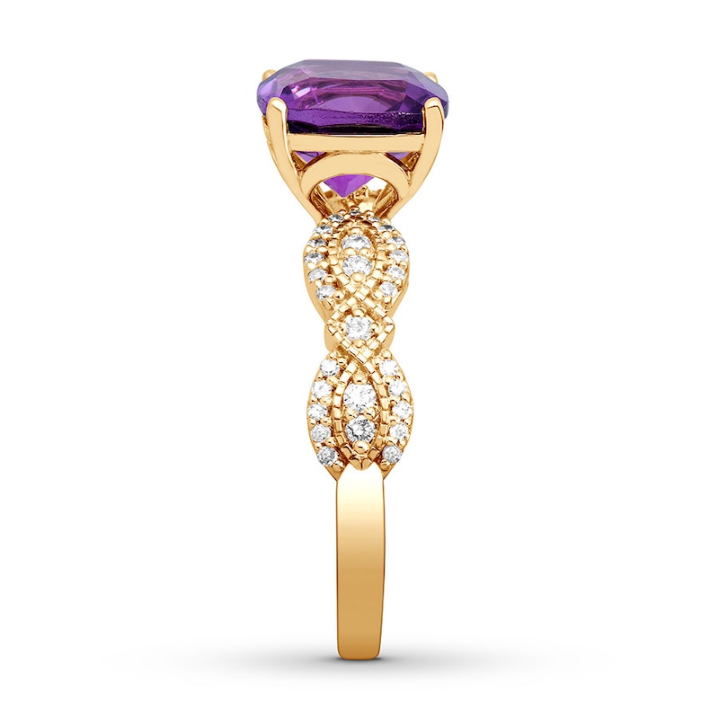 A captivating cushion-cut amethyst and beautiful 14K yellow gold band create a regal design in this incredible engagement ring. Sparkling twists of round diamonds complete the design with a total diamond weight of 1/4 carat. From the Now & Forever® Bridal Collection.