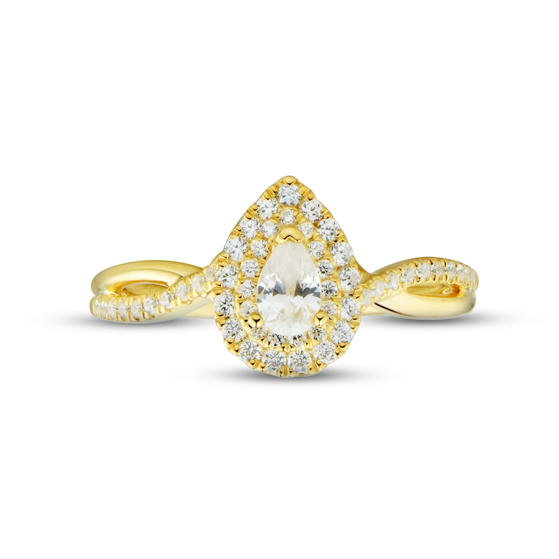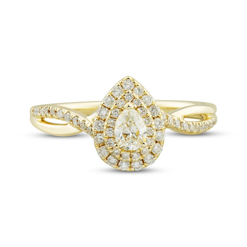 Take their breath away with this dazzling diamond engagement ring. The beautiful design features a pristine pear-shaped diamond embraced by two bright halos of round-cut diamonds. The gracefully twisting band is traced with more round diamonds for extra sparkle and shine. Crafted in classic 14K yellow gold, the ring has a total diamond weight of 1/2 carat and is from our Now & Forever® bridal collection.