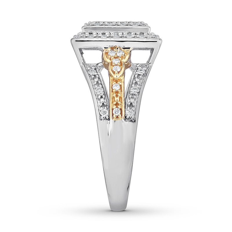 This eye-catching engagement ring displays tightly nestled princess-cut diamonds in the center framed by two rows of shimmering round diamonds. Diamonds set in 14K yellow gold decorate the center of the band for elegant contrast. Crafted of 14K white gold, the ring has a total diamond weight of 1/2 carat.