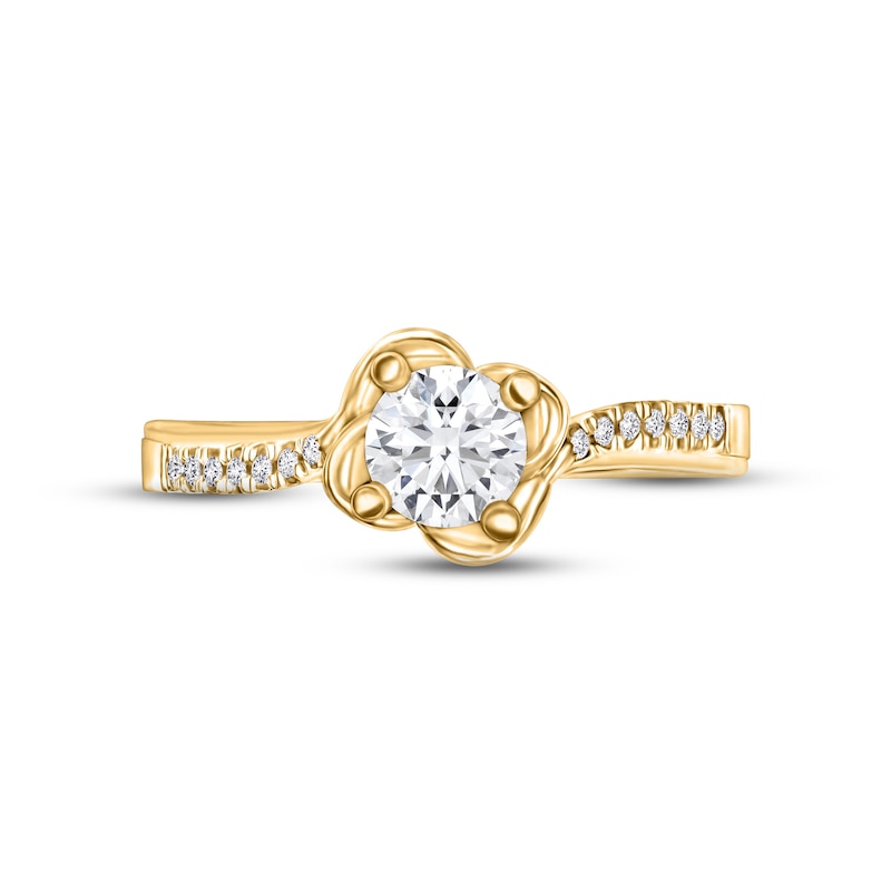 This wonderful engagement ring displays a 1/2-carat round-cut diamond nestled in beautiful petals of 14K yellow gold. More round diamonds shimmer down the gently contoured band. The ring has a total diamond weight of 1/2 carat and is from our Now & Forever® bridal collection.