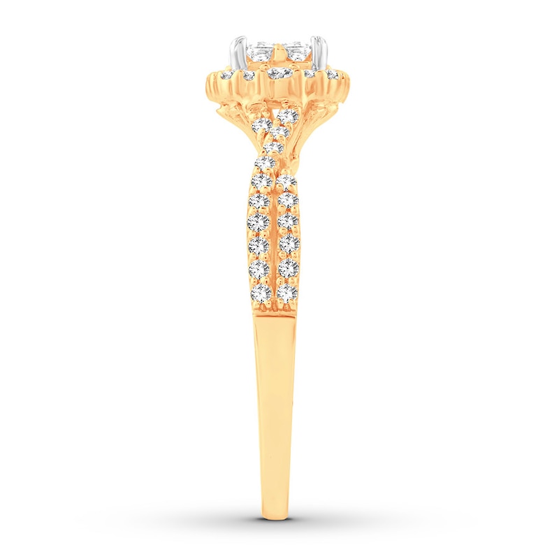This beautiful engagement ring showcases four princess-cut diamonds framed by round diamonds for more sparkle. The 14K yellow gold band features twists of diamonds to complement, bringing the total diamond weight to 1/2 carat.