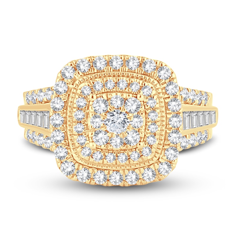 Two souls, one heart. Start your forever journey with a sparkling symbol of what lies ahead. A captivating cluster of round-cut diamonds emits a chorus of sparkle when beautifully wrapped by two halos of round diamonds. The stunning cushion-shaped silhouette shines even brighter when placed amidst rows of brilliant baguette-cut and extra round diamonds throughout the band. Styled in gleaming 14K yellow gold, the ring has a total diamond weight of 1 carat and is from our Now & Forever® bridal collection.