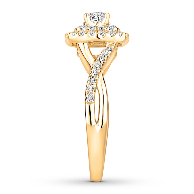 Sparkling round diamonds are arrayed in a framed design at the center of this splendid engagement ring. Ribbons of 14K yellow gold and more diamonds twist together to create the band, bringing the total diamond weight to 3/4 carat. From the Now & Forever® Bridal Collection.