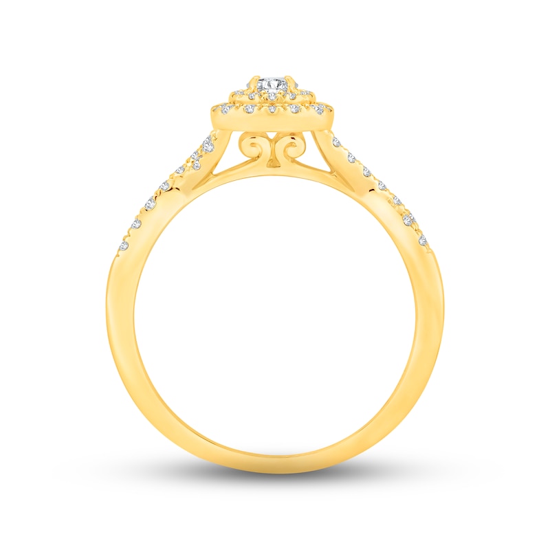 A radiant round diamonds sparkles as the focal point of this gorgeous engagement ring for her. Two rows of brilliant round diamonds frame the center, and more round diamonds shimmer down the gracefully twisted band. Styled in 10K yellow gold, the ring has a total diamond weight of 3/8 carat. From the Now and Forever® bridal collection.