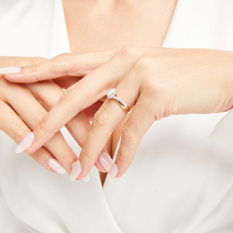 A lovely symbol of your love, this beautiful engagement ring displays a sparkling oval-cut diamond embraced by a shimmering halo of radiant round diamonds. More round diamonds glimmer throughout the elegantly twisted band. Crafted in classic 14K yellow gold with white rhodium contrast, the ring has a total diamond weight of 1/2 carat and is from our Now & Forever® bridal collection.