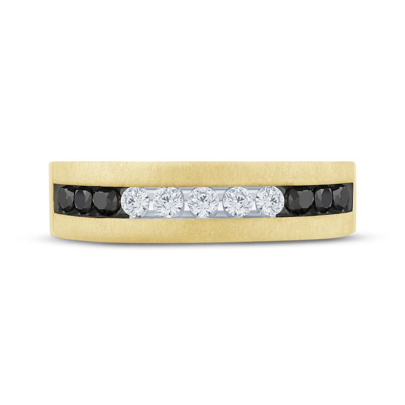 Honor him with a sophisticated wedding band. Created in 10K yellow gold with polished and satin finishes, this band surprises with a center channel filled with round white diamonds with white rhodium detail, flanked by round black diamonds with black rhodium detail. This chic design sparkles with a total diamond weight of 5/8 carat. From the Now & Forever® collection.