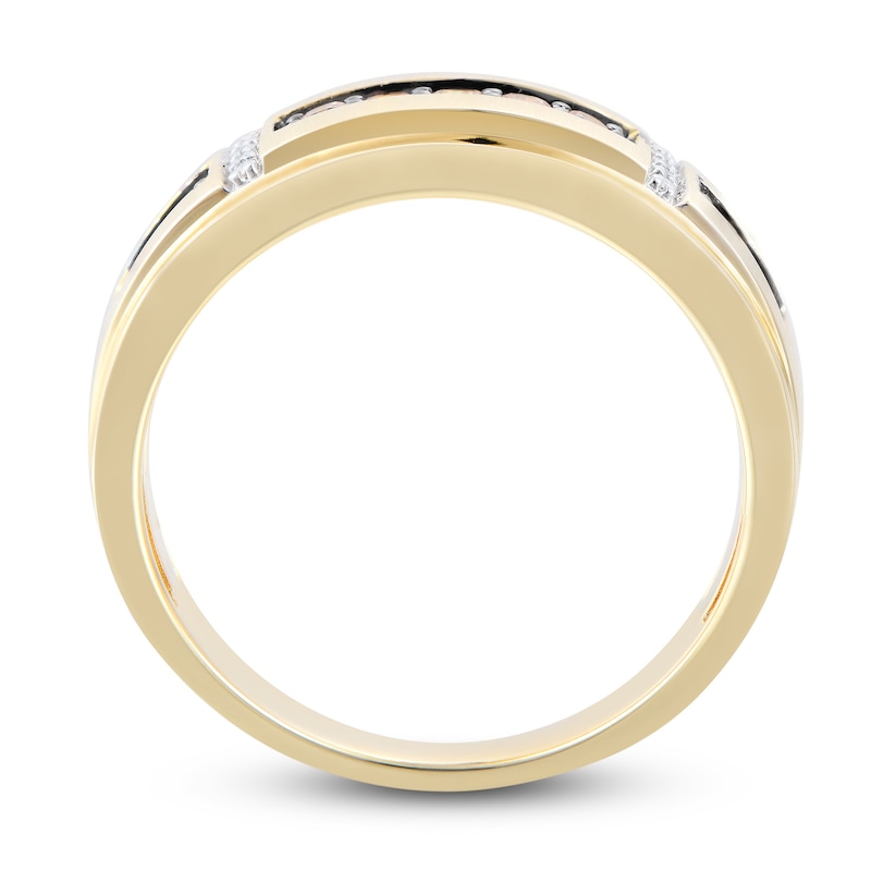 This sleek men's wedding band shines in satin-finished 10K yellow gold. Columns of brilliant round-cut white diamonds meet rows of beautiful brown diamonds for a total diamond weight of 1/3 carat. From the Now & Forever® collection.