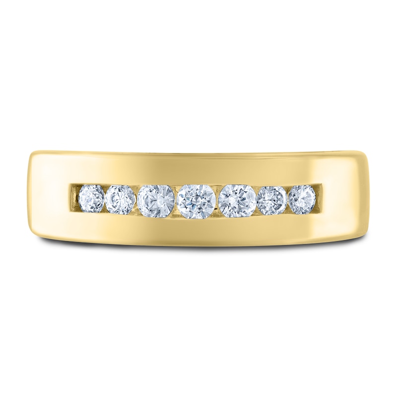 This handsome men's wedding band from THE LEO Diamond® collection showcases a gorgeous row of brilliant round-cut independently-certified diamonds. The diamonds are channel-set in the timeless 14K yellow gold band, totaling 3/8 carat in weight.