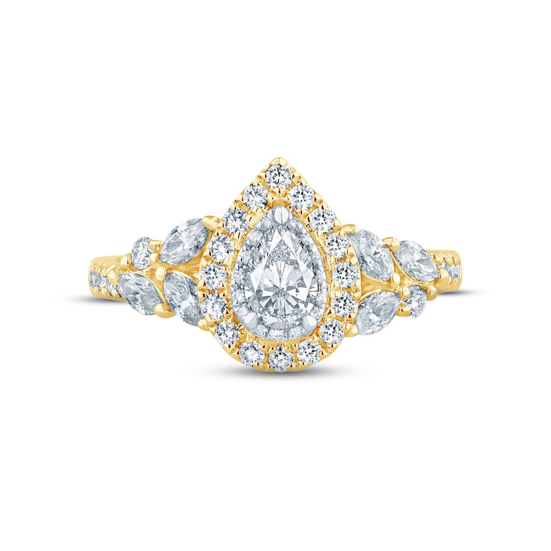 This luxe and lovely engagement ring displays a stunning 1/3-carat pear-shaped diamond styled in cool 18K white gold and traced by dainty round diamonds. More round diamonds frame the center design, while marquise-cut diamonds dazzle on the flanks. Additional round diamonds shine along the top and sides of the band, which is fashioned in 18K yellow gold, for a total diamond weight of 1 1/4 carats. The independently certified center diamond is laser-inscribed with a unique Gemscribe® serial number to ensure your peace of mind. From the Monique Lhuillier Bliss collection, available exclusively at KAY. Please note: This ring is available in limited sizes. If you don't see your size here, please visit a store to order your ring.