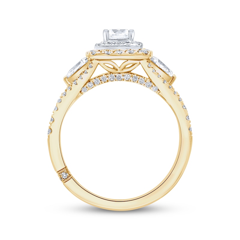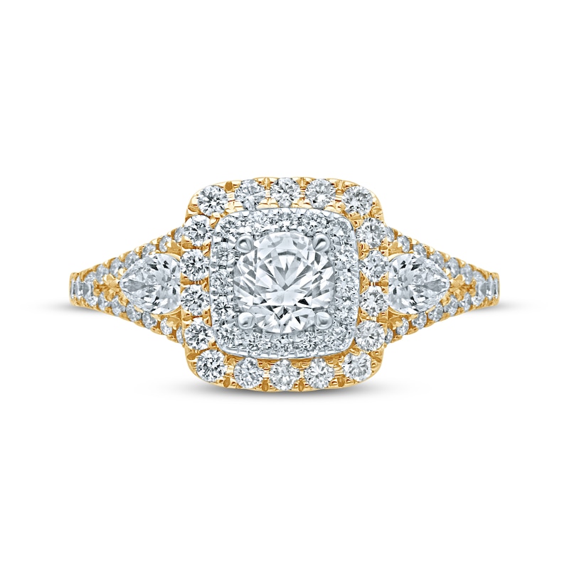 A stunning symbol of your romance, this breathtaking engagement ring is destined to be hers. A radiant 3/8-carat round diamond is styled in 18K white gold and sparkles within a cushion-shaped double frame of round diamonds. A glistening pear-shaped diamond adorns each flank, while more round diamonds converge on the 18K yellow gold band. Finished with dainty round diamonds that dance across the bridge, the two-tone ring has a total diamond weight of 1 1/6 carats. The independently certified center diamond is laser-inscribed with a unique Gemscribe® serial number to ensure your peace of mind. From the Monique Lhuillier Bliss collection, available exclusively at KAY. Please note: This ring is available in limited sizes. If you don't see your size here, please visit a store to order your ring.