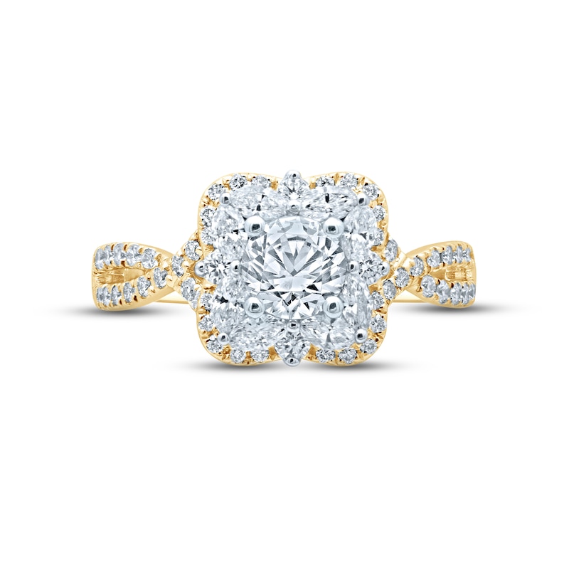 A showstopping 3/4-carat round-cut diamond is embraced by a glittering frame of marquise-cut diamonds in this sensational engagement ring for her. Delicate round diamonds trace the clover-shaped center and shimmer down the interweaving, split-shank band, complemented by classic milgrain details. Dainty round diamonds grace the bridge to finish the look. Styled in 18K yellow and 18K white gold, the ring has a total diamond weight of 1 3/8 carats. The independently certified center diamond is laser-inscribed with a unique Gemscribe® serial number to ensure your peace of mind. From the Monique Lhuillier Bliss collection, available exclusively at KAY. Please note: This ring is available in limited sizes. If you don't see your size here, please visit a store to order your ring.