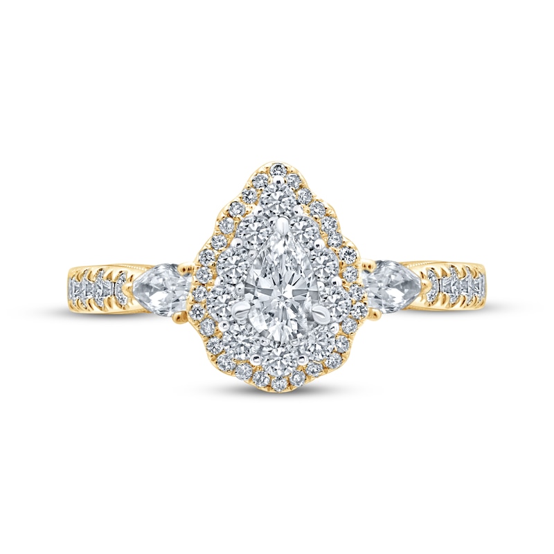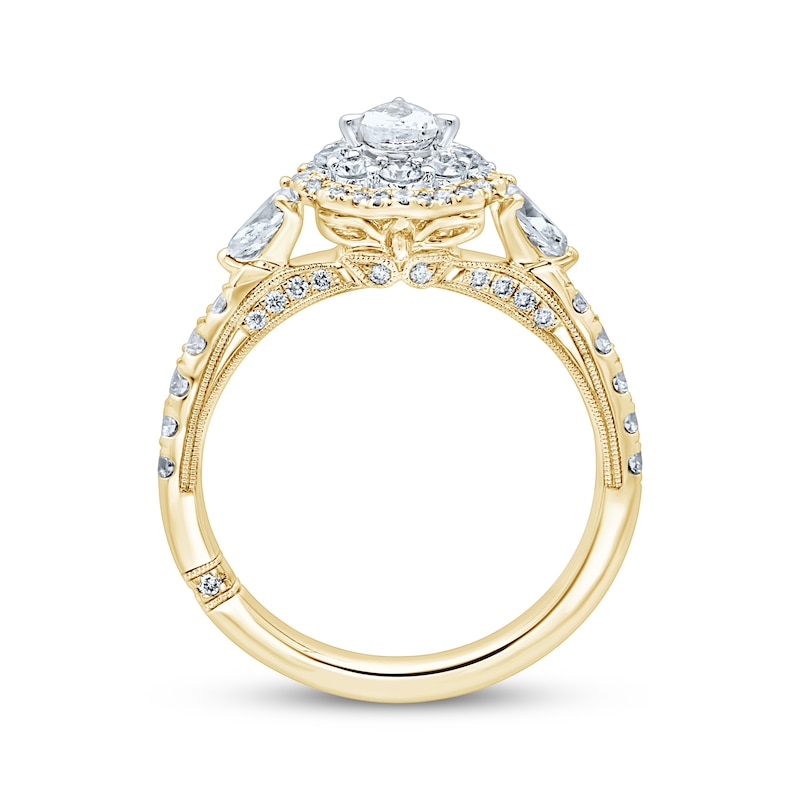 An exquisite work of art, this engagement ring is the perfect blissful beginning to your next chapter. A 1/3-carat pear-shaped diamond is framed in round diamonds and styled in 18K white gold at the center. A scalloped outer frame of round diamonds adds an intricate touch, while pear-shaped diamonds bring sparkle to the flanks. Bright round diamonds adorn the 18K yellow gold band and bridge for a total diamond weight of 1 1/4 carats, and milgrain detailing finishes the elegant look. The independently certified center diamond is laser-inscribed with a unique Gemscribe® serial number to ensure your peace of mind. From the Monique Lhuillier Bliss collection, available exclusively at KAY. Please note: This ring is available in limited sizes. If you don't see your size here, please visit a store to order your ring.