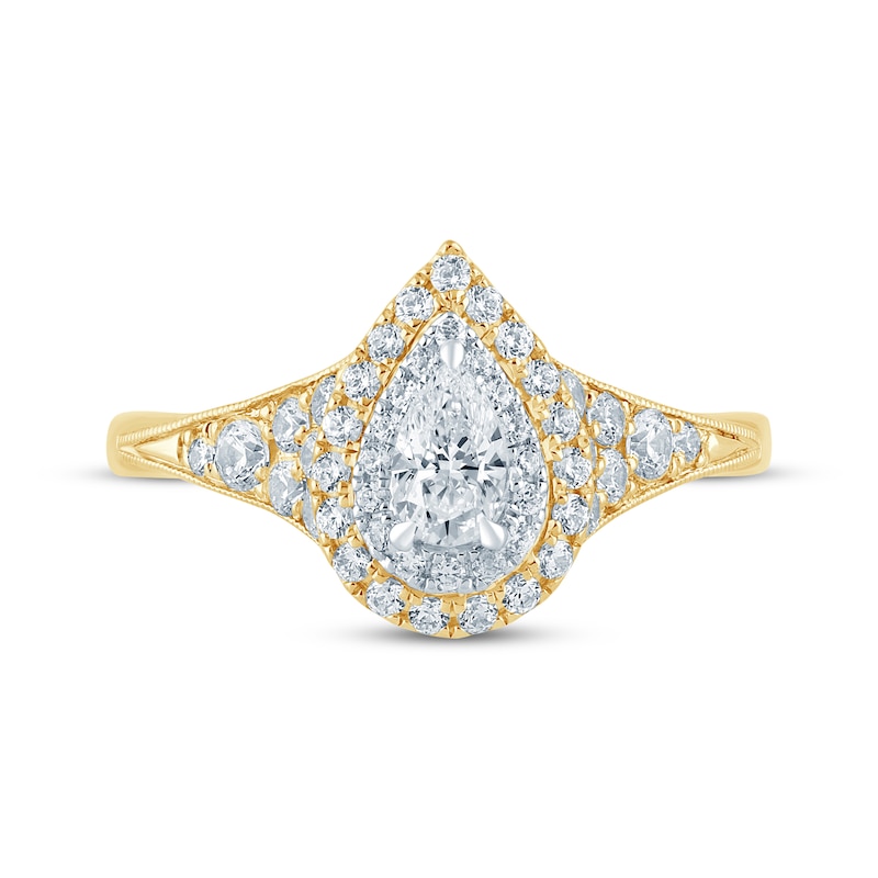 - The focal point is a dazzling 1/4-carat pear-shaped diamond in a double frame of round-cut diamonds