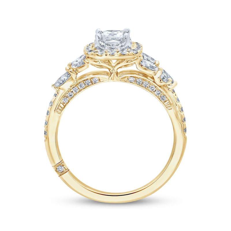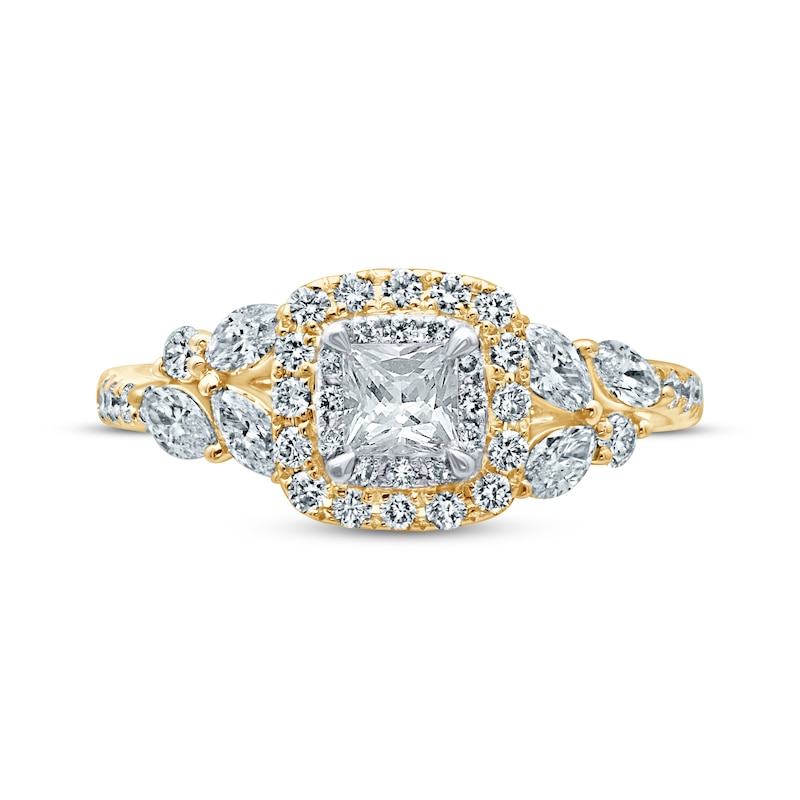 This dreamy engagement ring brings the perfect touch of glamour to her finger. A glittering 3/8-carat princess-cut diamond is framed in radiant round diamonds and styled in 18K white gold at the center. Fashioned in timeless 18K yellow gold, an outer frame of round diamonds creates an elegant cushion-shaped silhouette, while marquise and round-cut diamonds cascade along the shank. Finished with round diamonds that dance down the band and across the bridge, this exceptional ring has a total diamond weight of 1 1/6 carats. The independently certified center diamond is laser-inscribed with a unique Gemscribe® serial number to ensure your peace of mind. From the Monique Lhuillier Bliss collection, available exclusively at KAY. Please note: This ring is available in limited sizes. If you don't see your size here, please visit a store to order your ring.