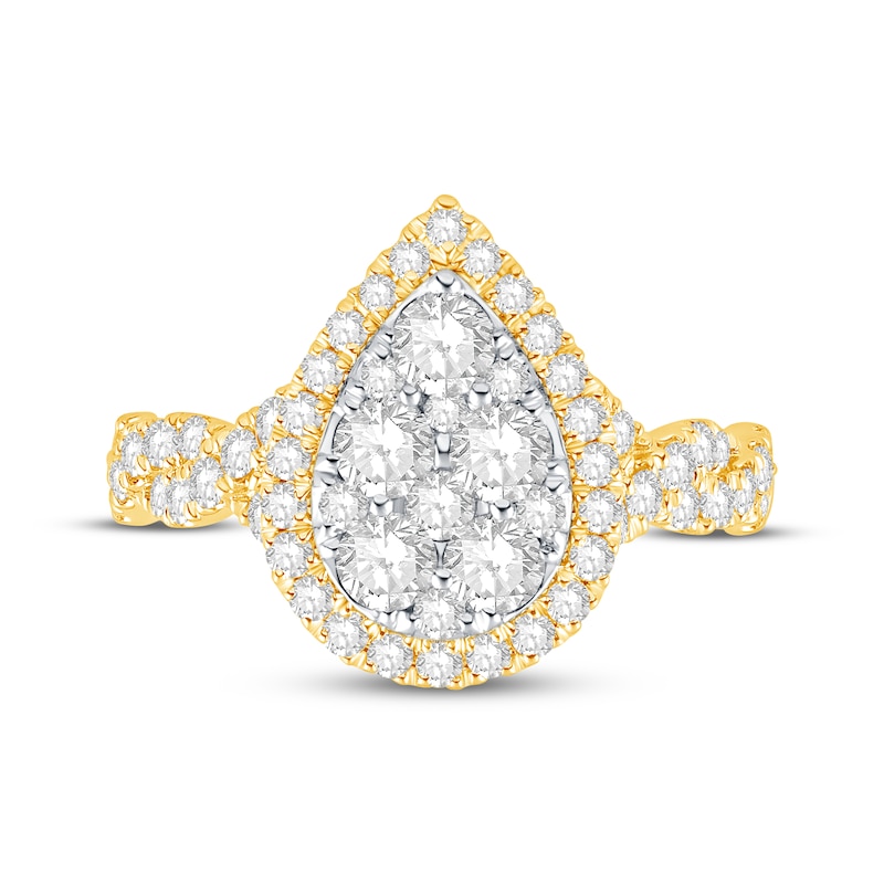 Wow her with the big look of this diamond engagement ring. At its center, a pear-shaped composite of round diamonds is set in a 14K white gold frame. A ribbon of round diamonds in 14K yellow gold wraps the centerpiece, while diamonds twist along the shank. Dazzling with a total diamond weight of 1 1/2 carats, this engagement ring is your love sign. From the Now & Forever® bridal collection.