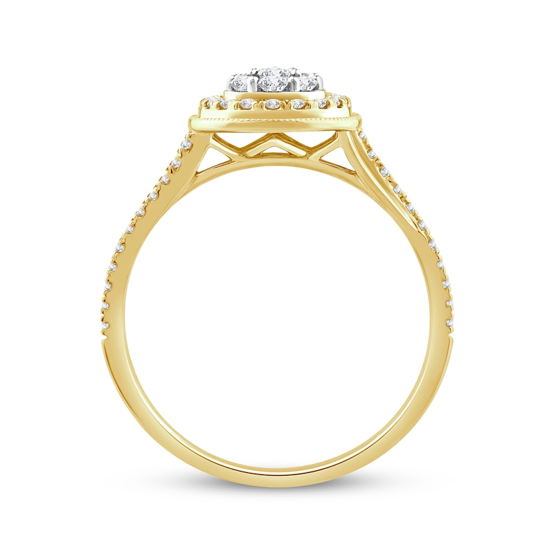 Appeal to her love of vintage with this sparkling engagement ring. Crafted in 14K yellow gold, the design shimmers with a teardrop-shaped composite of round-cut diamonds in white rhodium. A frame of round diamonds and a border of milgrain detailing complete the centerpiece. Round diamonds along the split shank bring the total diamond weight to 1/2 carat. From the Now & Forever® bridal collection.