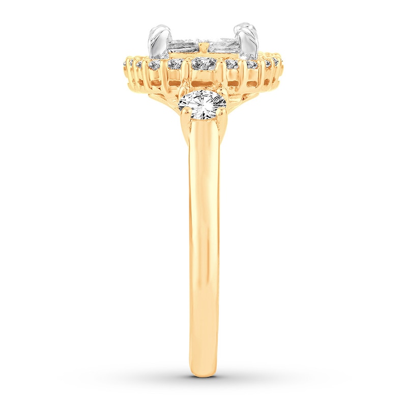 You love each other more than anything, and you're ready to declare your love to the world. Celebrate that next step with this stunning engagement ring. The center displays four sparkling princess-cut diamonds haloed by round diamonds, with an additional round diamond on each side. Accents of 14K white gold complete the look. Styled in classic 14K yellow gold, the ring has a total diamond weight of 1 5/8 carats.