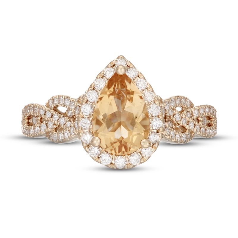A luminous pear-shaped citrine shines at the center of this stunning engagement ring for her. Sparkling round diamonds frame the center and adorn the interweaving band, which is styled in classic 14K yellow gold. The ring has a total diamond weight of 1/2 carat. From the Neil Lane Bridal® collection