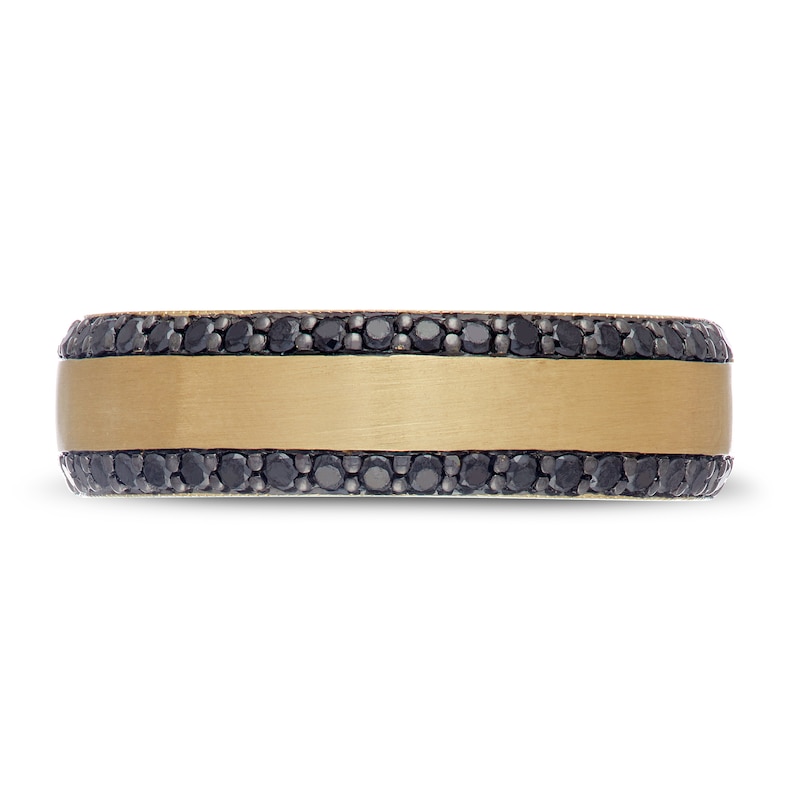This Neil Lane™ men's wedding band is crafted in handsome 14K yellow gold, and features round black diamonds emboldened along the outer edges for a striking look. The eye-catching wedding band has a total diamond weight of 1/2 carat.