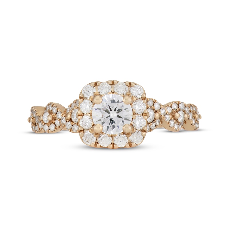- A radiant 1/2-carat round-cut diamond is wrapped in a cushion-shaped frame of smaller round diamonds