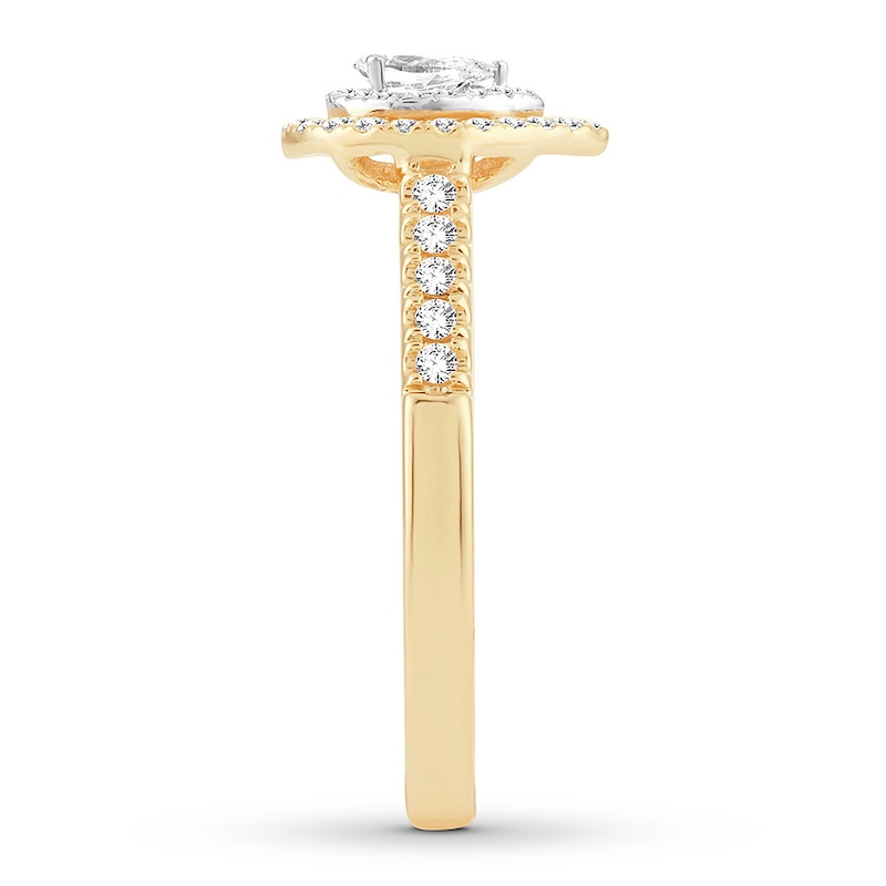 A pear-shaped diamond is the dazzling focal point of this engagement ring for her, styled 14K yellow gold. Round diamonds complete the look, bringing the total diamond weight to 1/2 carat.