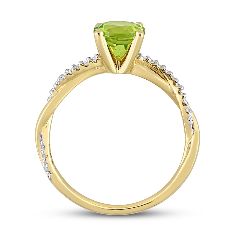 For a love as vibrant as yours, give her a ring to match. A vivid round-cut peridot glimmers at the center of this gorgeous engagement ring, set in timeless 14K yellow gold. Brilliant round diamonds weave down the band, totaling 1/6 carat in weight. From the Now & Forever® bridal collection.