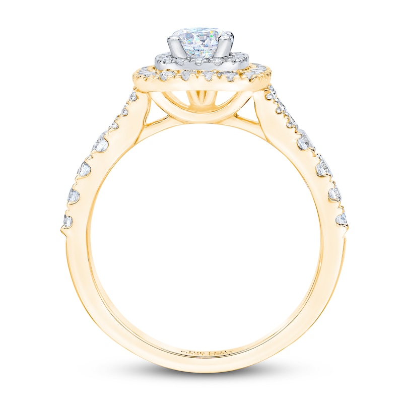 This mesmerizing two-tone diamond engagement ring for her features a brilliant round-cut First Light® diamond at its center set in beautiful 14K white gold prongs. From Leo Schachter, the center diamond features Fire Prism™ technology, creating infinite flashes of color for more fire and sparkle. Sparkling round-cut diamonds set in 14K white gold halo the center diamond, and a frame of more round diamonds set in 14K yellow gold finish the center design. More round-cut diamonds shimmer down the 14K yellow gold band for a total diamond weight of 1 carat. The diamonds are independently certified, and the center diamond is laser-inscribed with a unique Gemscribe® serial number to ensure your peace of mind. Live Your Love in Color.™