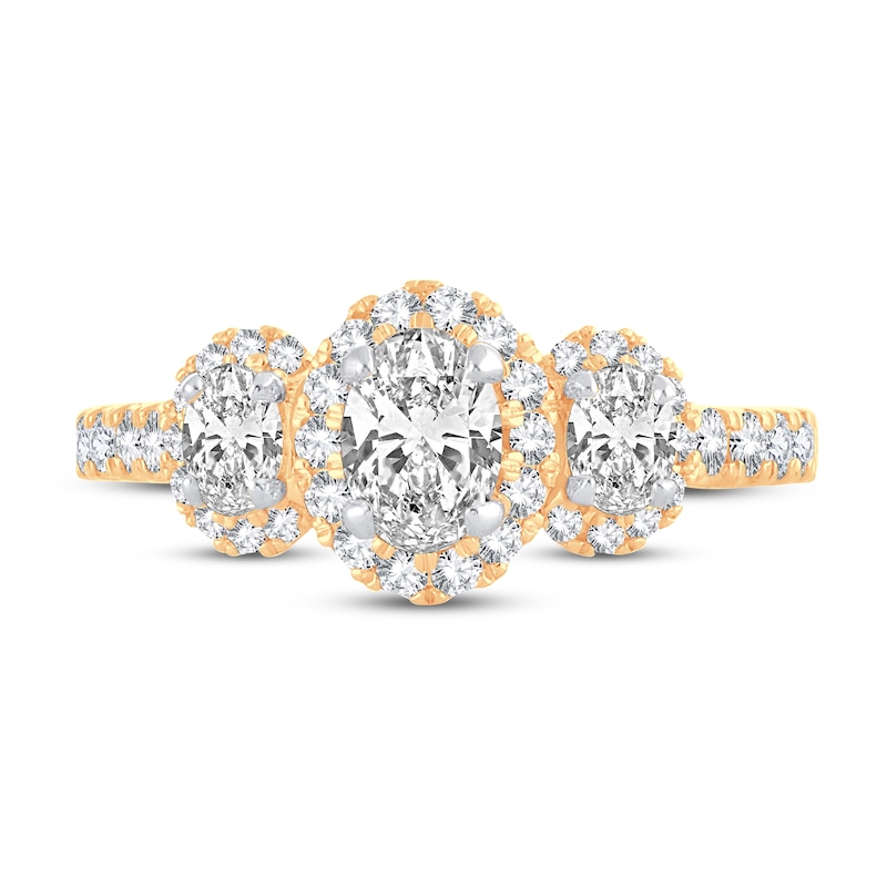 A gorgeous 1/2-carat oval-cut diamond shines at the center of this three-stone engagement ring, flanked by two smaller oval-cut diamonds. Each center diamond is haloed by brilliant round diamonds, and more sparkle down each side of the band. The ring is crafted in timeless 14K yellow gold and has a total diamond weight of 1 3/4 carats. From the Now & Forever® bridal collection.
