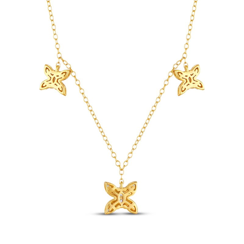 - At the center, a butterfly decorated with round- and baguette-cut diamonds suspends at the Y