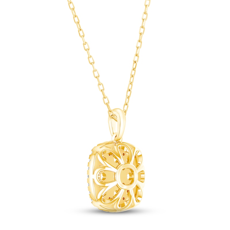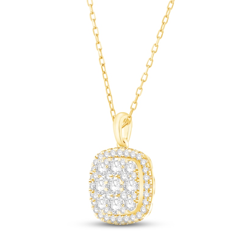 This beautiful diamond necklace features a cushion-shaped pendant set in timeless 10K yellow gold. Gorgeous round diamonds cluster at the center, and more round diamonds shimmer along the frame for a total diamond weight of 1 carat. The pendant hangs from an 18-inch cable chain and secures with a spring ring clasp.