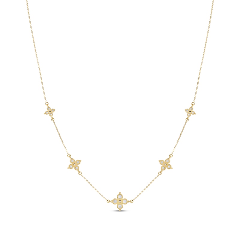 - Round-cut diamond in white rhodium plate create each quatrefoil station