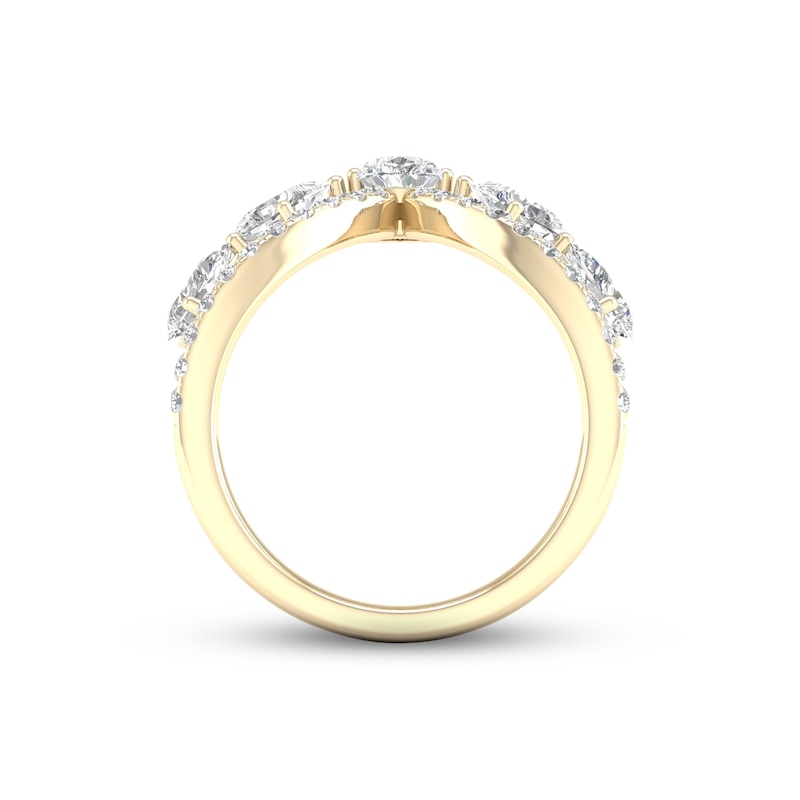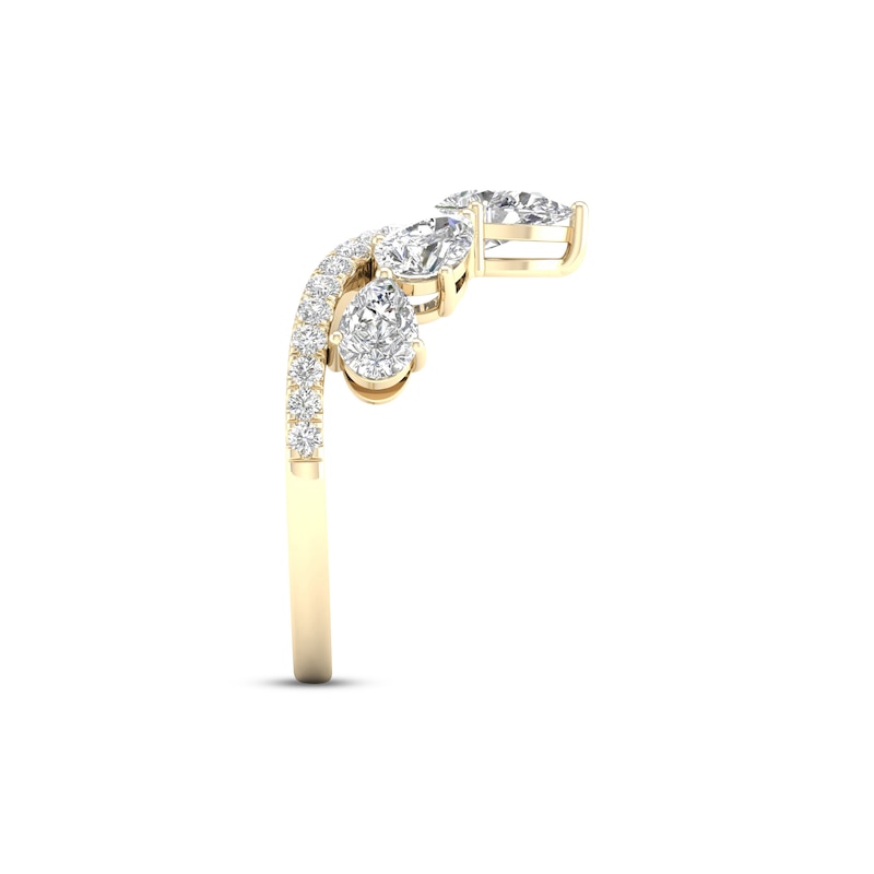 This gorgeous ring for her shines in 14K yellow gold in an eye-catching V shape. Stunning pear-shaped diamonds sparkle along the design, and brilliant round diamonds line below for a total diamond weight of 1 1/2 carats.