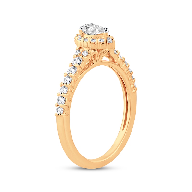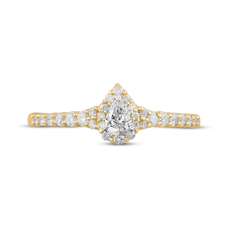 This beautiful engagement ring showcases a stunning pear-shaped diamond haloed by brilliant round diamonds. More round-cut diamonds sparkle down the sides of the band for a total diamond weight of 1/2 carat. The ring is set in timeless 14K yellow gold. From the Now & Forever® bridal collection.