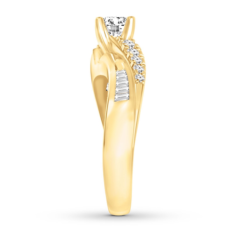 A 1/2-carat round diamond shines in the center of a graceful curve of more sparkling diamonds in this wonderful engagement ring. Baguette diamonds add the finishing touch, bringing the total diamond weight to 5/8 carat. The ring is styled in timeless 14K yellow gold.