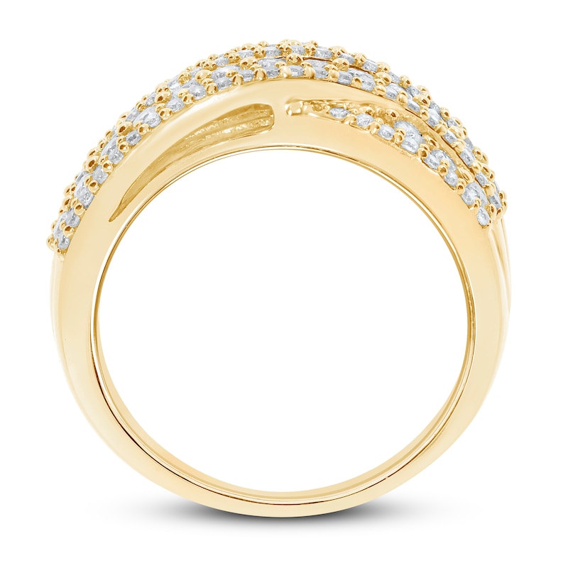This gorgeous diamond ring for her features rows of brilliant round-cut diamonds that wrap across the band, totaling 1 carat in weight. The ring is fashioned in classic 10K yellow gold.