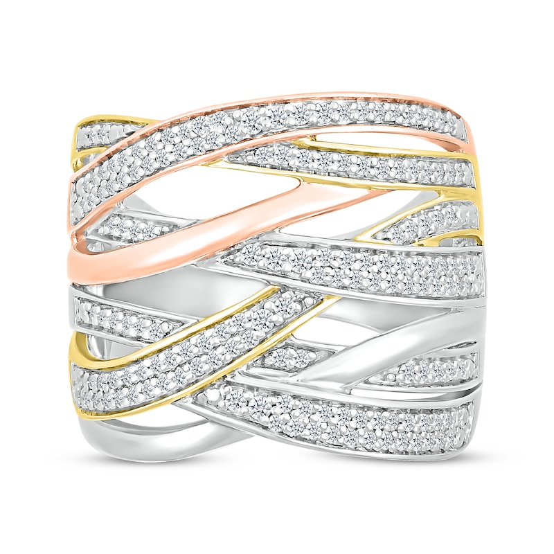 This intriguing multi-row ring brings color and sparkle in a bold silhouette. Crafted in sterling silver, the design features bands of 10K rose and 10K yellow gold that create a tri-tone look. Polished bands crisscross with rows of glittering round-cut diamonds along the wide style. The ring has a total diamond weight of 1/2 carat.