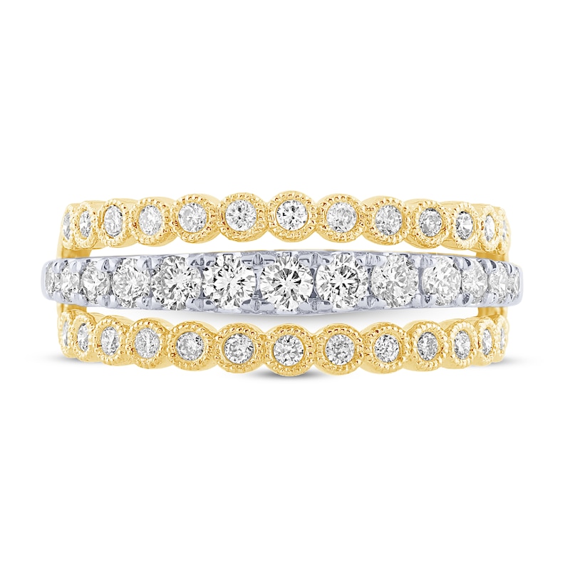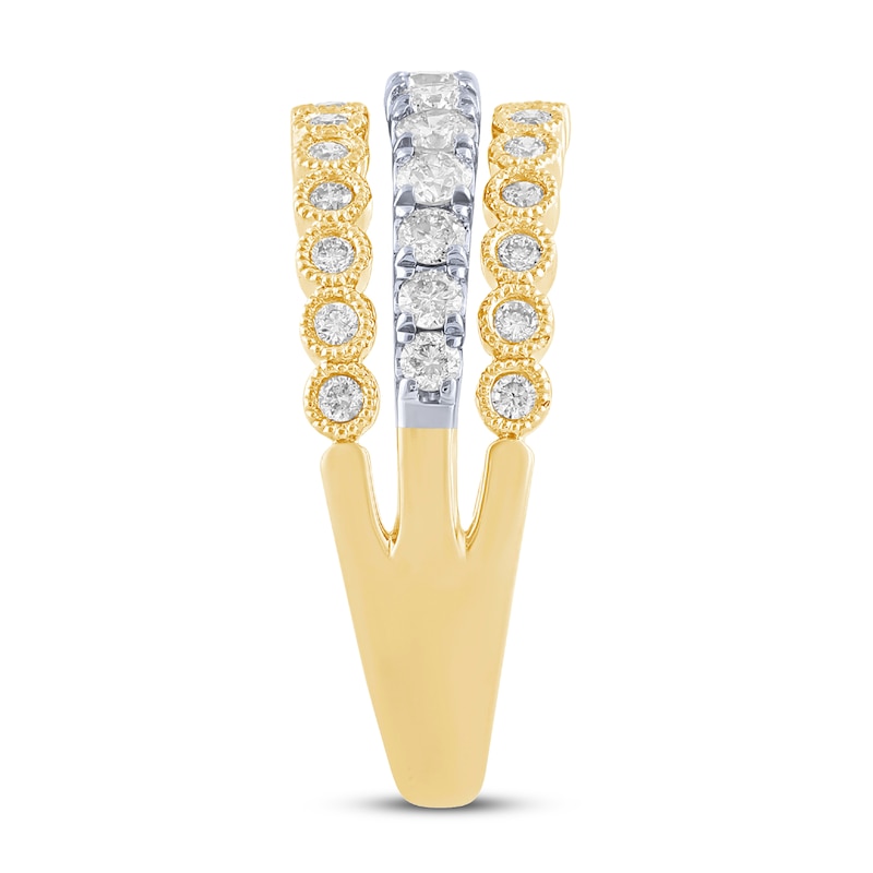 This amazing diamond ring for her is crafted primarily of classic 10K yellow gold. The outer sides of the band each hold a dazzling row of round diamonds, while the inside of the band features a channel of 10K white gold that is graced with a row of more sparkling round diamonds. The stylish ring has a total diamond weight of 3/4 carat.