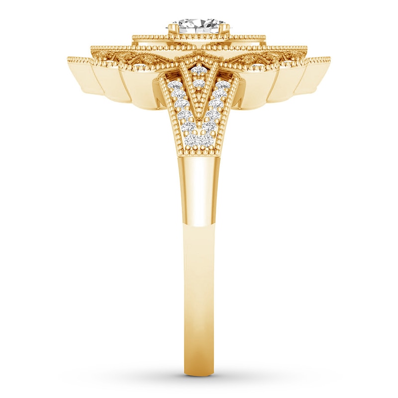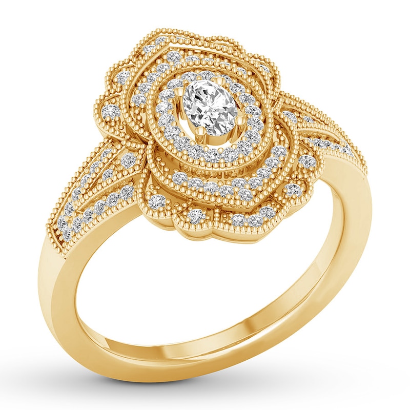 A sparkling oval-shaped diamond and a vintage-inspired frame adorned with round diamonds capture attention in this striking ring for her. Milgrain detail adds the finishing touch. Styled in classic 10K yellow gold, the ring has a total diamond weight of 3/8 carat.